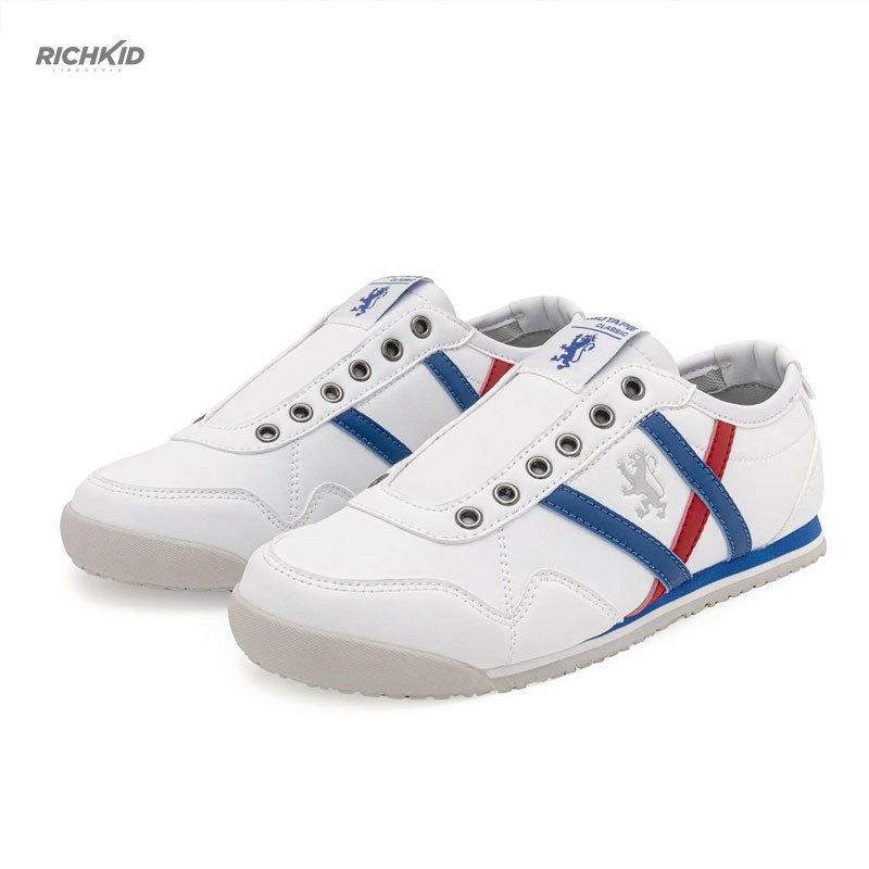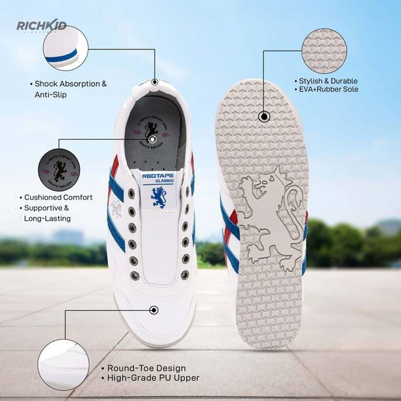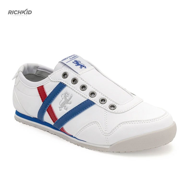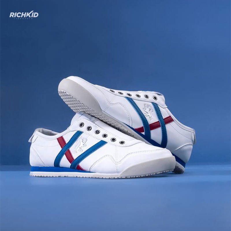 The classic white base is enhanced with bold blue and red side stripes, giving the sneaker a fresh, athletic vibe that pairs easily with jeans, chinos, or casual trousers. A lightweight cushioned sole and textured rubber outsole ensure comfort, grip, and durability throughout the day.