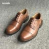 Stylish classic derby shoe with upper made of full grain Tuscany vegetable tanned leather in dark brown and handmade decorations.